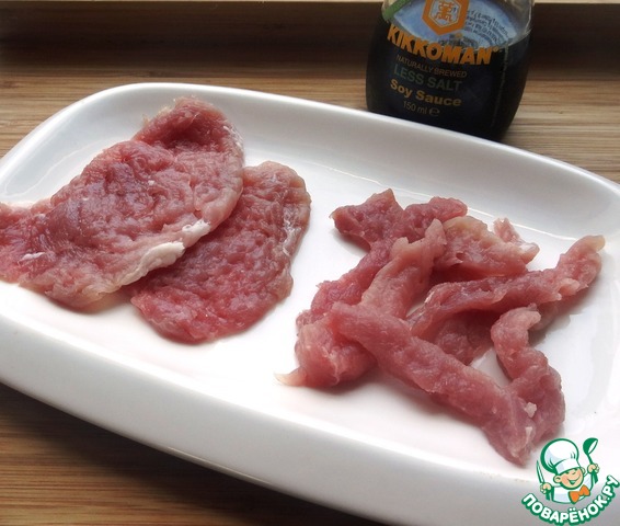 Мясо можно использовать любое. Его необходимо зачистить от жилок и плёнок. Нарезать ломтиками и отбить до толщины 2-3 мм. Затем нарезать полосками, ширина их должна быть 5-7 мм. Размешать ломтики мяса с соевым соусом.
