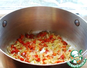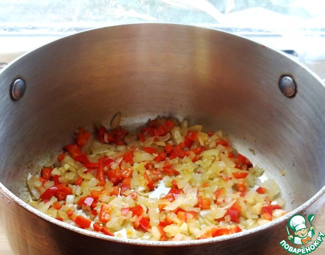 Мелко нарезать лук, чеснок и болгарский перец. Обжарить овощи на растительном масле 5 минут.