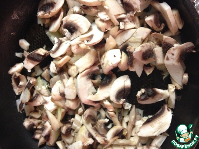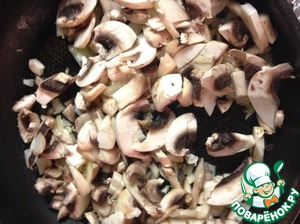 Нарезать мелко грибы и лук. Лук поджарить на оливковом масле до прозрачности. Добавить грибы, обжарить.
