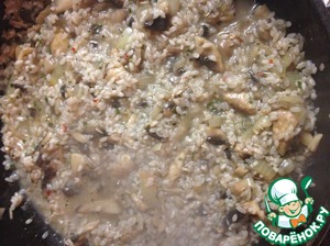Добавляем специи. Готовим рис, добавляя бульон:как только бульон впитался, добавляем ещё. Рис должен дойти до состояния "Аль денте", важно, чтобы он не разварился.
