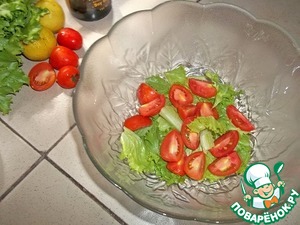 Овощи промыть и обсушить. Лист салата порвать, маленькие помидорки разрезать вдоль на 4 части.
