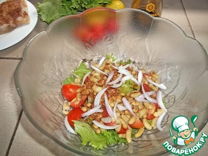 С консервированной фасоли слить сок и промыть, лук нарезать тонкими полукольцами, добавить к салату. Заправить салат 1ч. л. оливкового масла и 1ч. л. лимонного сока, лимонным перцем и щепоткой соли, перемешать.