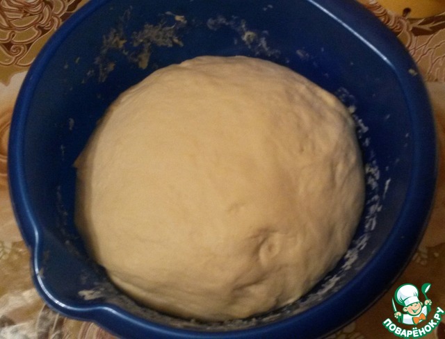 Молоко подогреваем и вливаем в смесь муки, соли и дрожжей. Вымешиваем тесто, постепенно добавляя оставшуюся муку. Добавляем размягченное масло. Еще раз вымешиваем. Формируем шарик, оставляем в миске. Миску накрываем полотенцем и ставим в теплое место на минут 40. Чтобы тесто поднялось.