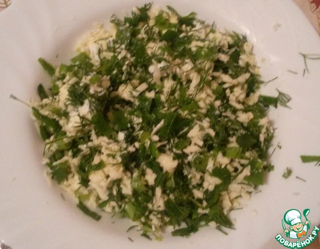 Тесто делим на 4 части (шарика). Делаем начинку. Трём сыр на тёрке. И мелко рубим зелень. Смешиваем сыр с зеленью. Каждый шарик раскатываем в тонкую лепёшку. Кладём начинку в центр. Собираем края теста в форме мешочка, слепляем и расплющиваем в лепёшку. Переворачиваем. Приминаем пальцами от центра к краям, чтобы начинка распределилась по всему хачапури. Делаем всё аккуратно, чтобы тесто не лопнуло.