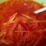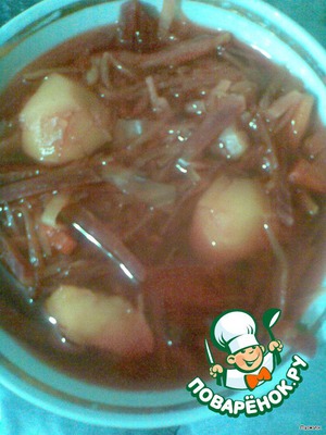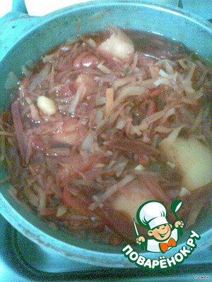 Bскипятить воду, порезанный крупно картофель положить в воду, пусть варится. За это время порезать морковь, свеклу соломкой, перец, положить варить, капусту нашинковать, тоже положить. Чтобы свекла не теряла свой цвет, полила борщик соком лайма, в конце добавить потертое яблоко, чеснок и зелень.