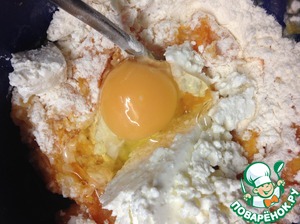 Просеять муку и крахмал в миску, добавить два вида пюре. Добавить творог. Вбить яйцо и желток.