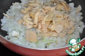 Добавляем нарезанные грибы. Грибы можете брать любые по желанию и наличию. У меня нарезанные варёные шампиньоны. Обжариваем грибы с луком около 5 минут.