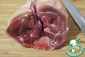 Рульку обмыть, обсушить и разрезать с одной стороны вдоль кости - кость аккуратно вырезать.