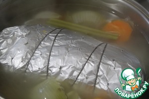 Выложить рульку в кастрюлю, налить воды так, чтобы покрывала рульку, добавить очищенные морковь и лук, черешковый сельдерей и поставить на огонь.