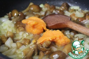 Выложить тыквенное пюре, перемешать, протомить минуту, влить сливки, упарить до желаемой густоты и откорректировать соус по своему вкусу.