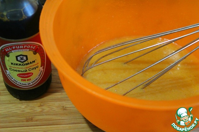 В чаше взболтать яйца, сливочное масло, соевый сладкий соус, сахар,