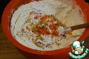 Просеянную муку соединить с разрыхлителем, содой, солью и специями, перемешать.