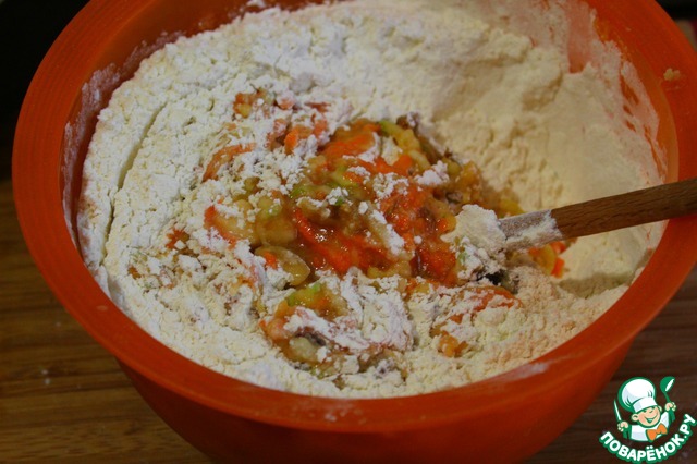 В жидкие добавить натертую морковь, кабачок, яблоки, клюкву, орехи и, постепенно всыпая муку, тшательно перемешать. -
