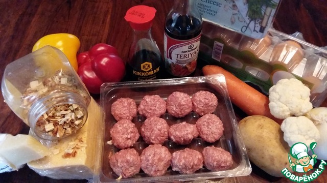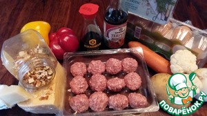Это основные ингредиенты. Фрикадельки я приготовила из смешанного фарша свинина-говядина с добавлением соуса-маринада "Терияки" от ТМ "Киккоман", репчатого лука и смеси перцев.