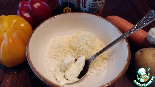 Для сырных фрикаделек 2 вида сыра натереть на мелкой терке и смешать со сливочным сыром, яйцом, и манной крупой. Оставить для набухания манки на 30 минут.
