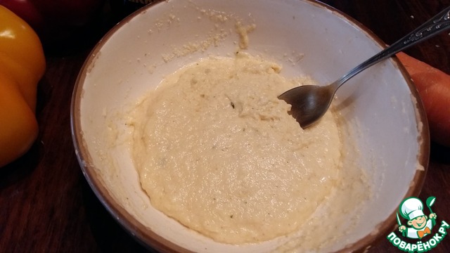 Вот так выглядит тесто для сырных фрикаделек после набухания манки. Оно не должно быть крутым, иначе фрикадельки получаться жесткими.