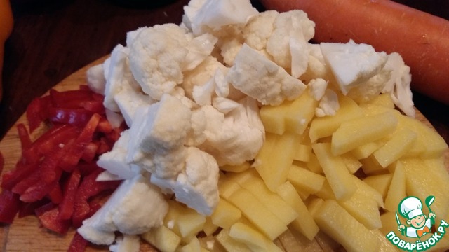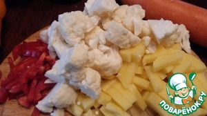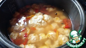 Я готовила суп в мультиварке. В кипящий бульон добавить сухие коренья, мясные фрикадельки, картошку, и при помощи кофейной ложечки сырные фрикадельки. Через 20 минут добавить в суп цветную капусту, помидор и болгарский перец. За 5 минут до готовности приправить суп душистым перцем и лавровым листом.