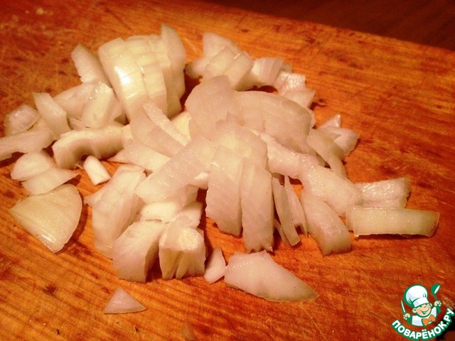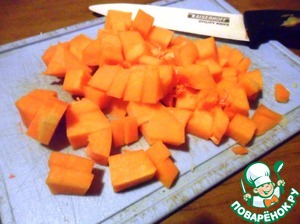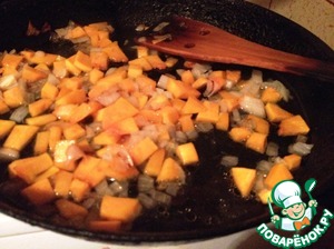 В сковороде разогреть растительное масло, выложить репчатый лук. ГОтовить до золотистого цвета. Добавить тыкву. Готовить помешивая до мягкости тыквы.