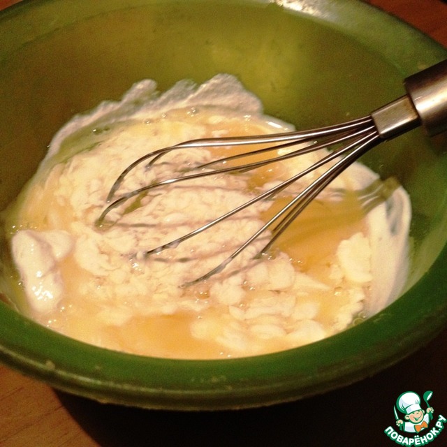 Творог смешать с сахаром, ванильным сахаром и яйцами.