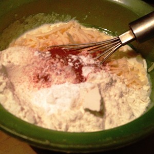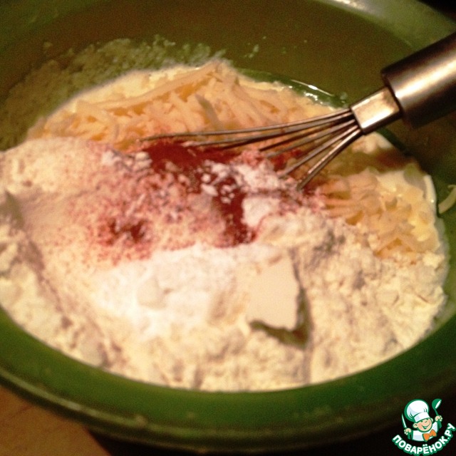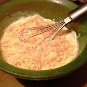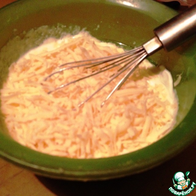 Сыр натереть на тёрке и добавить в смесь. Перемешать. -