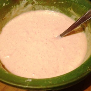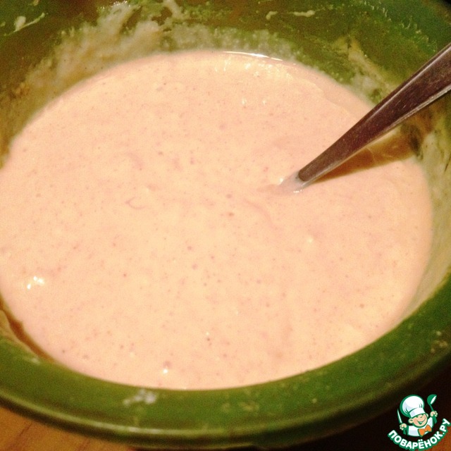 Манку соединить со сметаной. Перемешать и оставить на 1 час для набухания. К набухшей манке добавить яйца, масло, перемешать до однородности.