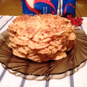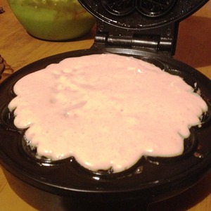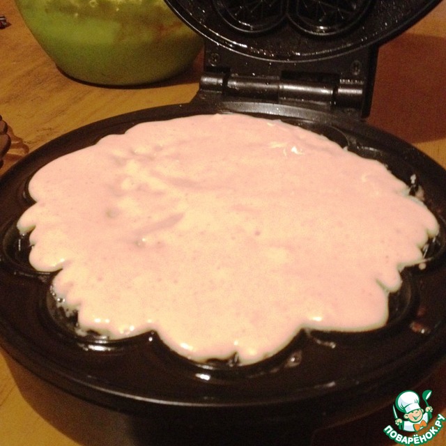 Перед выпечкой смазать вафельницу растительным маслом. Вылить 2 ст л теста, закрыть. Выпекать до золотистого цвета.