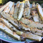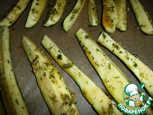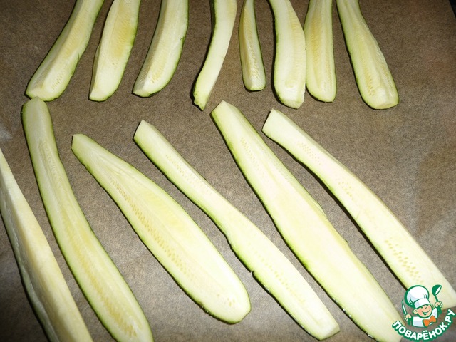 Цукини помыть, просушить, отрезать кончики, порезать на продольные полосочки на 4 части (если цуккини маленькие), а если большие, то на 6-8 частей.