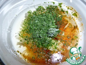 В миске смешать растительное масло, измельчённый чеснок, специи, зелень, лимонный сок, соль, смесь перцев.