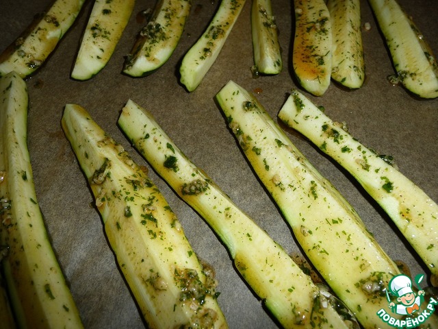 Выкладываем цуккини на противень, застеленный пекарской бумагой на расстоянии друг от друга, для того чтобы они могли зарумяниться со всех сторон.