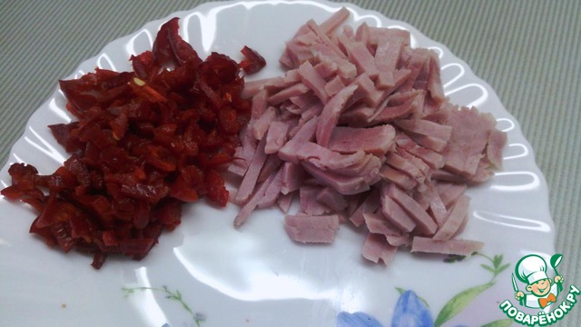 • Строгаем ветчину и перец для начинки, эта работа не должна занять больше 2 минут
