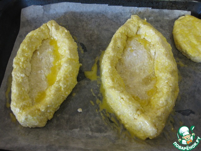 подпылить мукой стол или разделочную доску, выложить наше творожное тесто, разделить на две части и сформировать продолговатые лодочки, подворачивая края внутрь, примерно так), смазать края взбитым яйцом и поставить в духовку при температуре примерно 200*С - до легкого румянца -