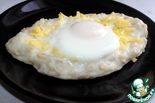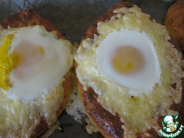 Насыпать сыр в лодочки, формируя в середине ямочку для яйца, разбиваем яйцо в центр, солим по вкусу и желанию и ставим в духовку до момента легкого схватывания желтка (он должен оставаться жидким)