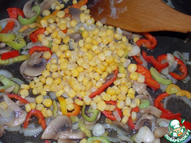 На растительном масле пожарить лук с грибами, добавить болгарский перец, порезанный соломкой.