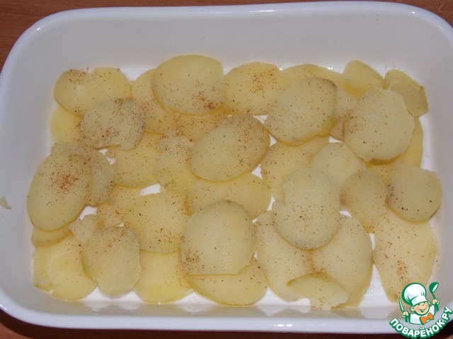 Форму для запекания смазать маслом, выложить слой картофеля, порезанного кружочками. Посолить и поперчить по вкусу.