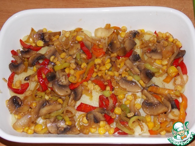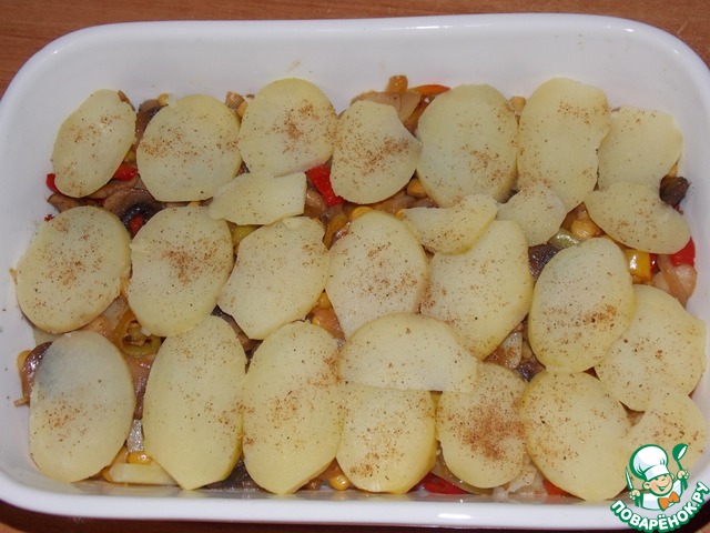 Наверх картофеля выложить грибы с овощами, немного поперчить.