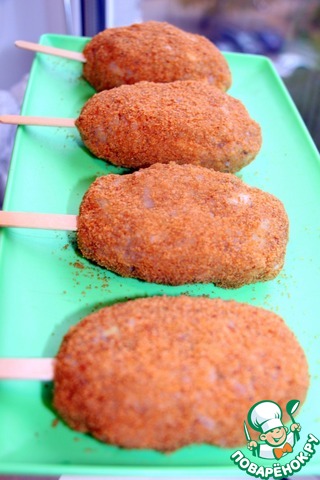 Обвалять их в молотых ржаных сухариках со вкусом бекона. Вставить палочки для мороженного, имитируя эскимо.