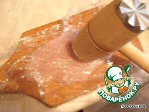 Филе разрезаем вдоль. Каждый кусочек отбиваем.
