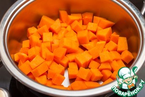 Тыкву очистить, нарезать кубиком, сложить в холодный сотейник, накрыть крышкой и готовить на слабом огне 15 минут, затем снять плиты и оставить под крышкой еще на 10 минут.