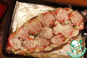 Сверху- помидор и смазать сметаной. Запекать при температуре 170 градусов 1-1,5 часа. За пять минут до готовности посыпать тертым сыром и дать ему расплавиться. Перед подачей посыпать зеленью. Получилась невероятно вкусная рыба под шубой из овощей.