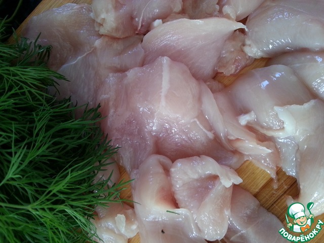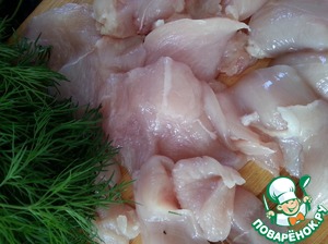 Куриное филе нарезать небольшими кусочками, как на отбивные.