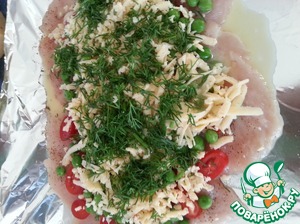 На куриные "отбивные" выложить слоями : горошек, помидоры нарезаные кружочками, сыр и зелень. Залить всю эту красоту взбитым яйцом, оно поможет не разваливаться рулету при нарезке.