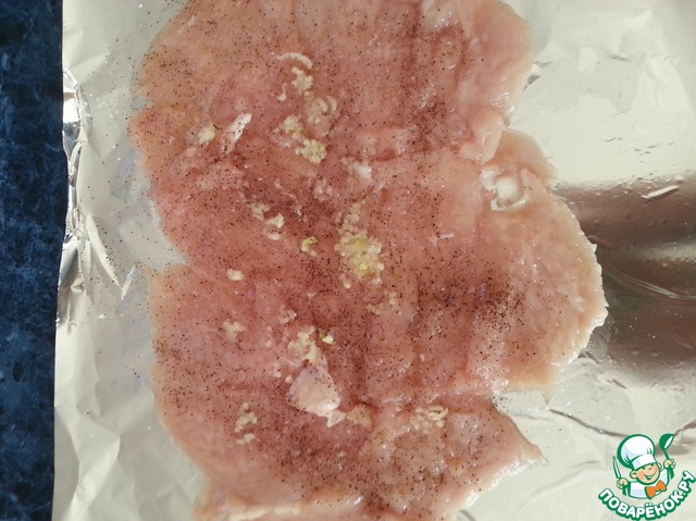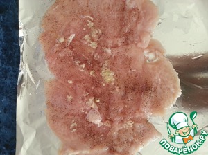 Куриные кусочки отбить и плотно выложить на лист фольги. Так, что бы между кусочками не было просветов. Посолить, поперчить по вкусу и добавить немного чеснока.