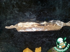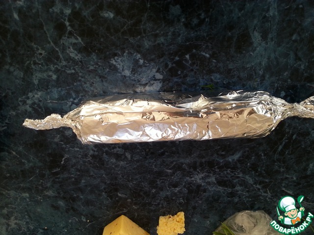 Аккуратно свернуть все это в рулет при помощи фольги и плотно закрепить концы, что бы при приготовлении не вытекал сок.
