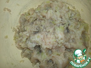 Перекручиваем на мясорубке куриное филе с 1/2 лука. Добавляем соль, перец. Фарш, конечно, можно купить, но приготовив его сами Вы точно будите уверены, что там мясо :)