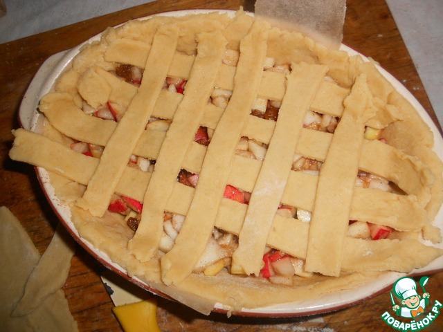 Меньшую часть теста раскатайте и нарежьте на полоски шириной 1,5 см. Оформите вверх пирога сеточкой. -