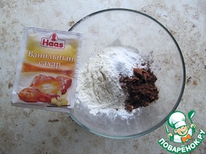 Пшеничную муку просеять с разрыхлителем теста, картофельным крахмалом, какао-порошком хорошего качества, щепоткой мелкой соли.