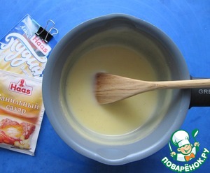 Для приготовления крема сварить пудинг из половины пачки "Смесь сухая для приготовления пудинга с ароматом ванили" от "HAAS" и 250 мл молока. Для этого соединить содержимое половины пакетика (20 г) с 4 ст. л. молока и 2 ст. л. сахара.
