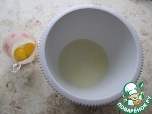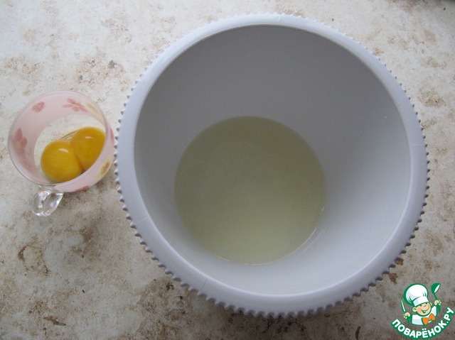 Два куриных яйца разделить на белки и желтки, в этом рецепте используем охлажденные белки.