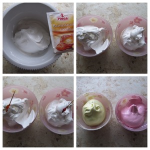 По желанию добавить к белкам пищевой краситель, вымешать, чтобы цвет стал однородный. -