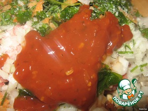 Смешать все ингредиенты, добавить мелко нарубленную зелень, томатную пасту, посолить, перемешать.
